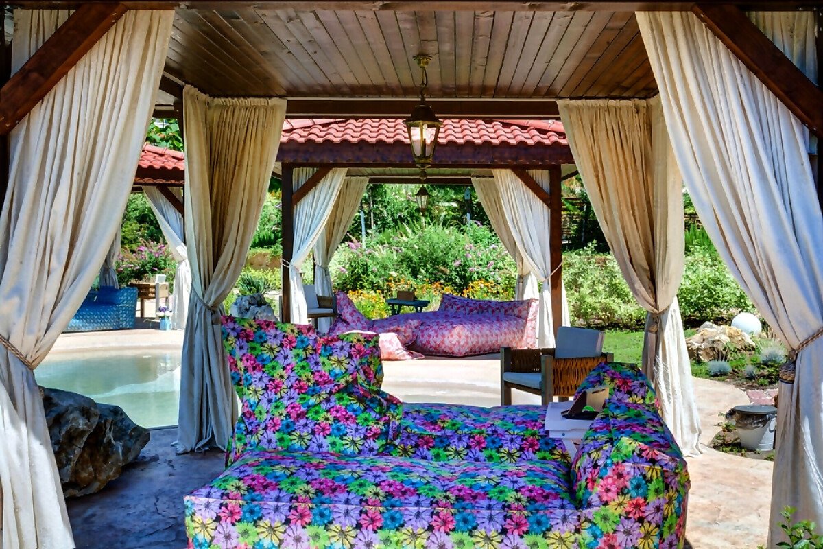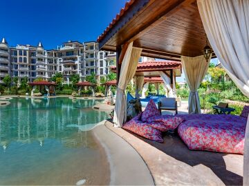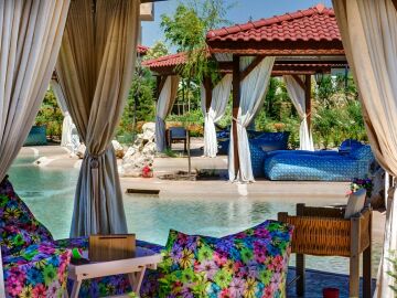 На територията на комплекса има разкошна градина, два басейна и ВИП зона със шатри за почивка, изкуствена река, детска площадка, тенис корт на открито, лоби бар, ресторант, предлагащ храна от най - висок клас и барбекю.