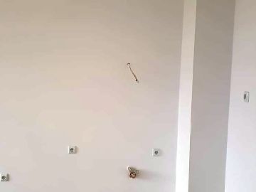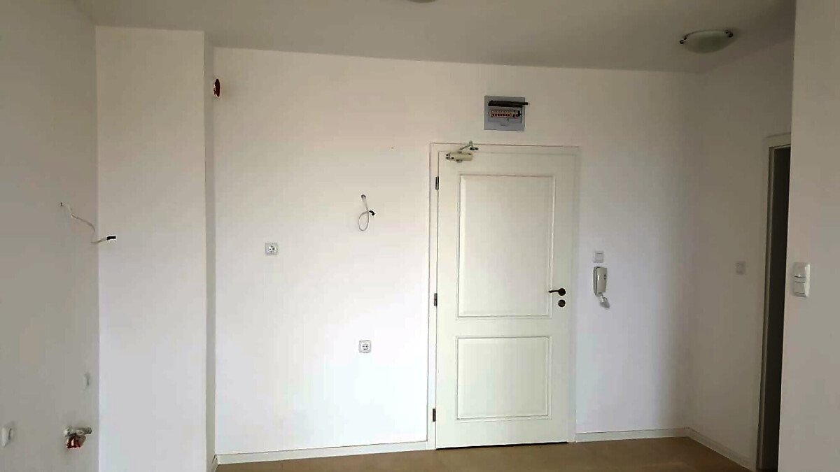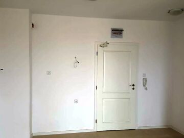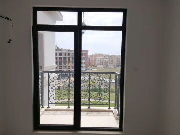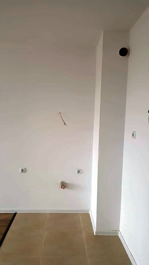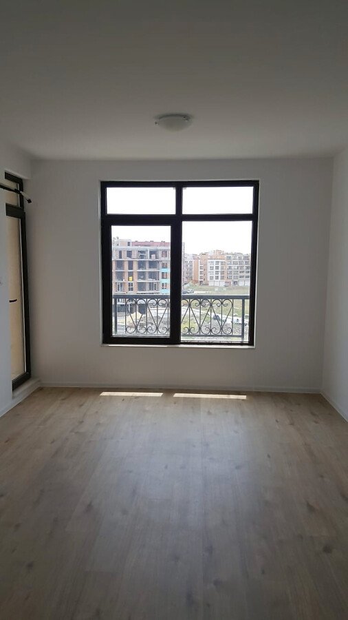 Жилището не е обзаведено, има панорамни прозорци, придаващи му просторност, подът е от ламинат и теракот.