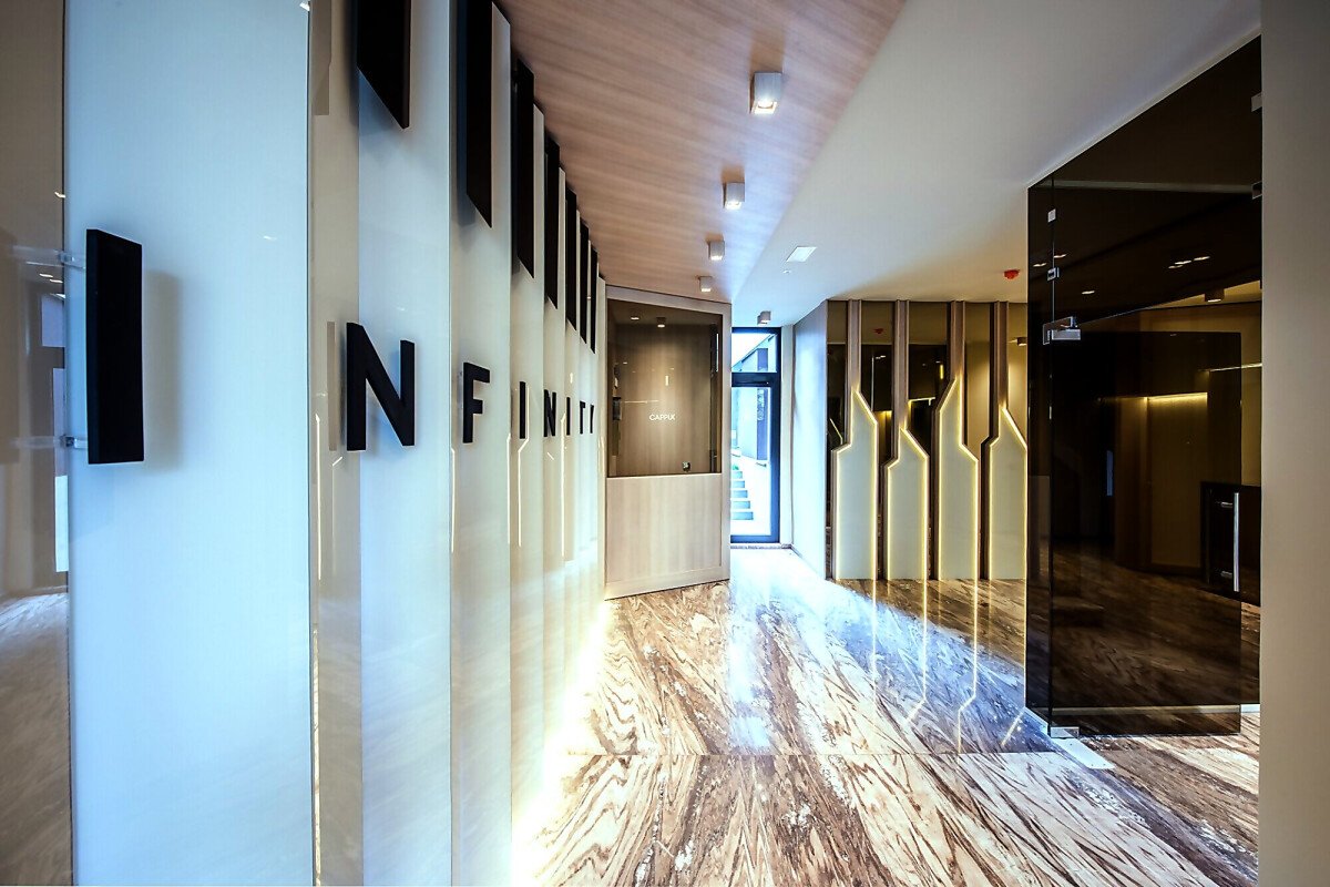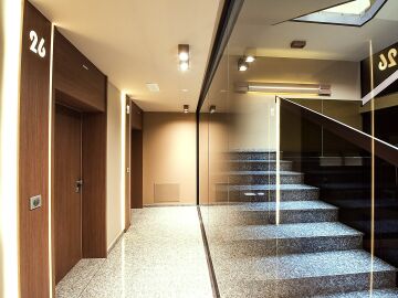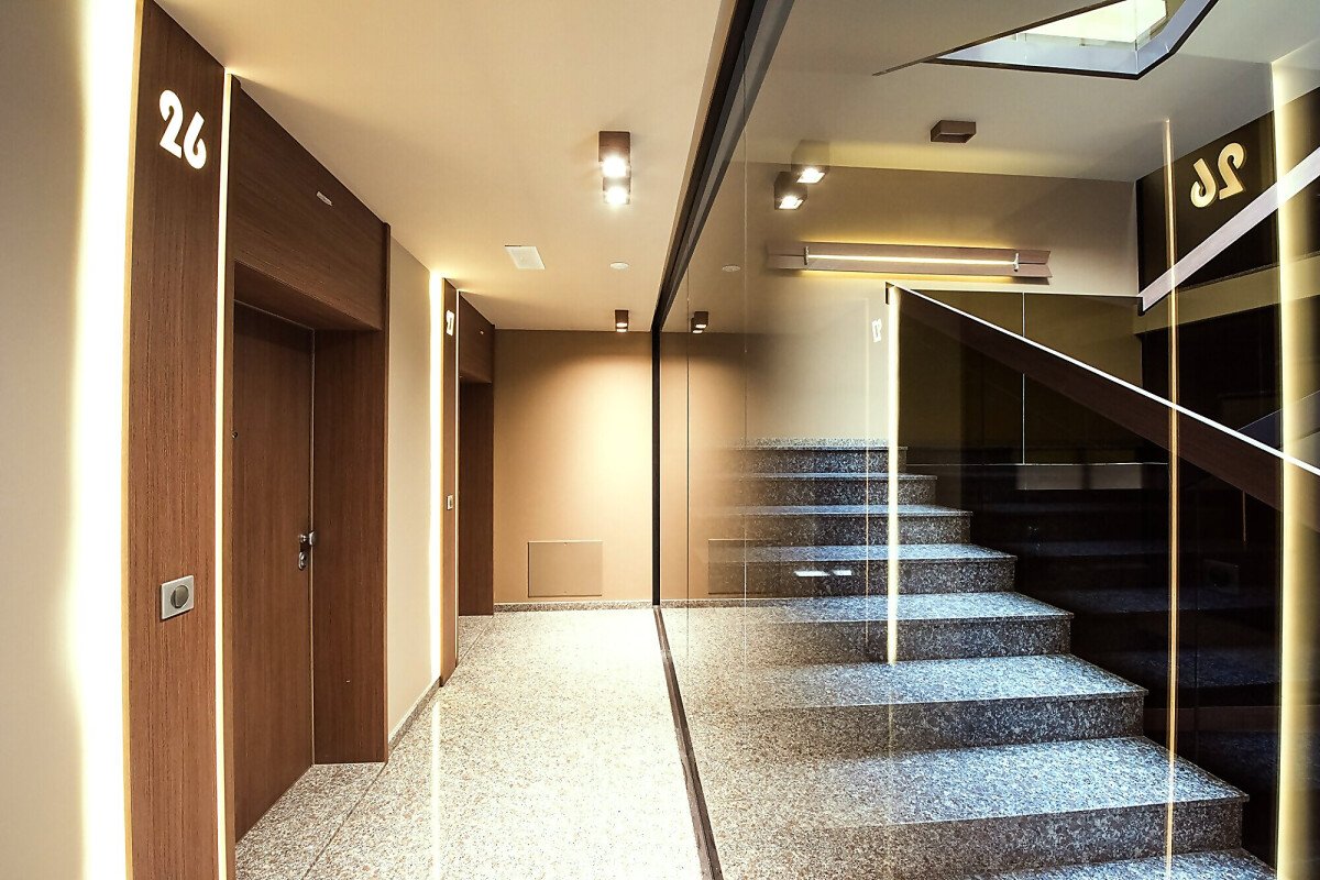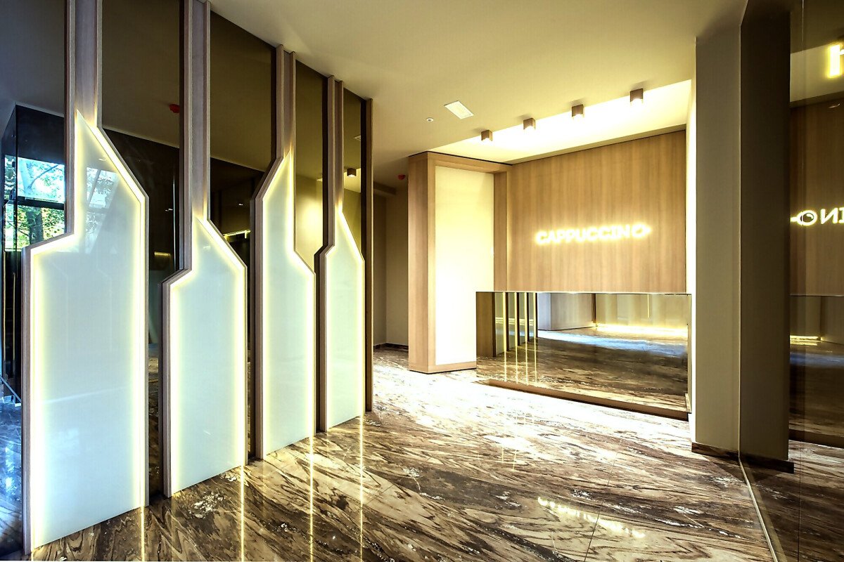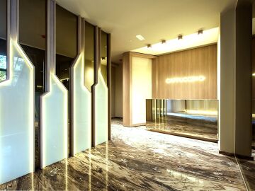 Входното фоайе впечатлява с луксозен дизайнерски облик, елегантна визия и стил.