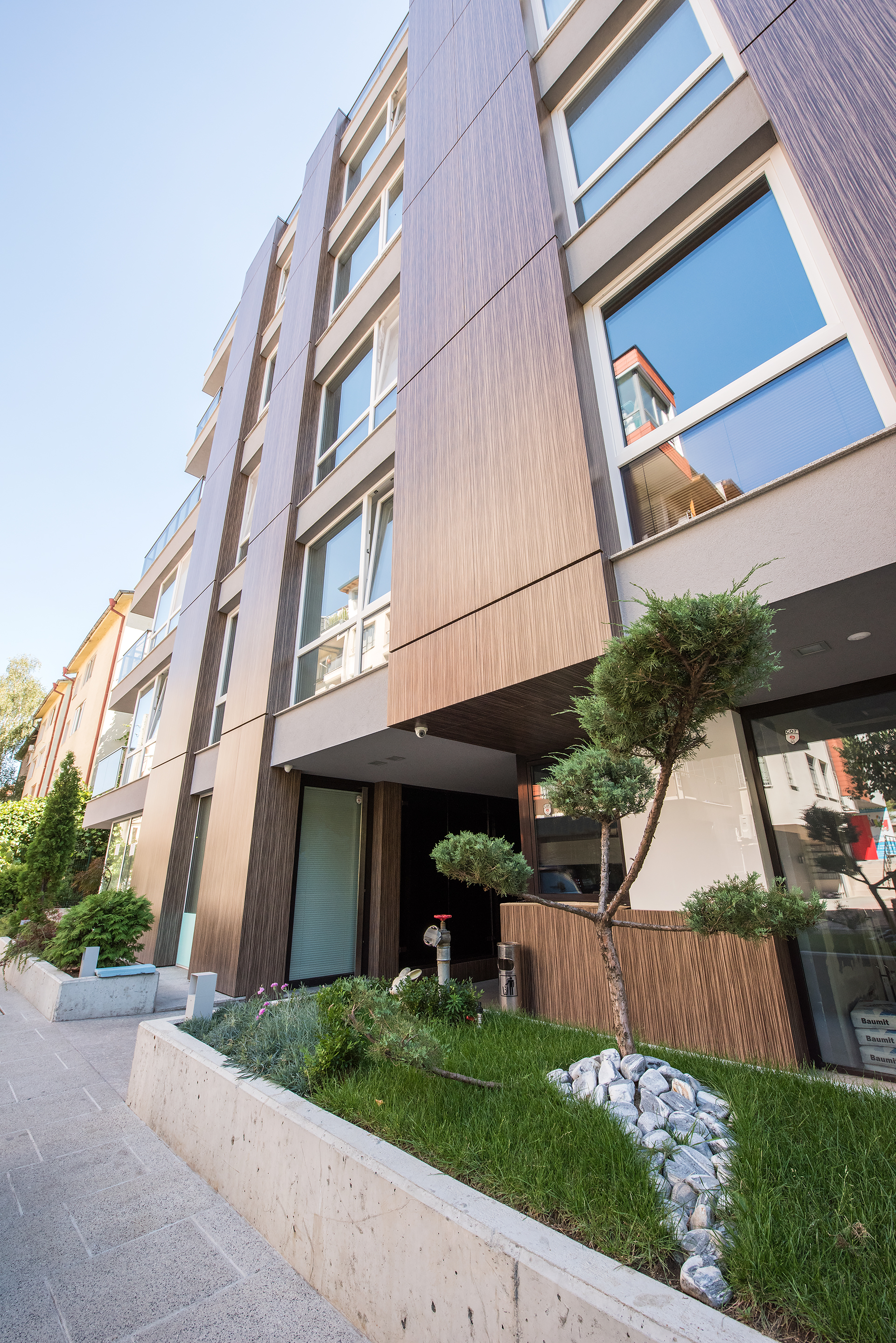 Сградата впечатлява с модерен облик и елегантен дизайн и предлага луксозно изпълнение, удобство, функционалност, сигурност и спокойствие.