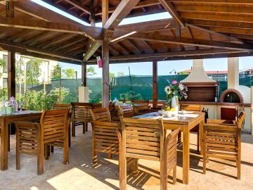 На територията си комплекса разполага с разкошна градина, където има два басейна и ВИП зона със шатри за почивка, изкуствена река, детска площадка, тенис корт на открито, лоби бар, ресторант - предлагащ храна от най - висок клас и барбекю.